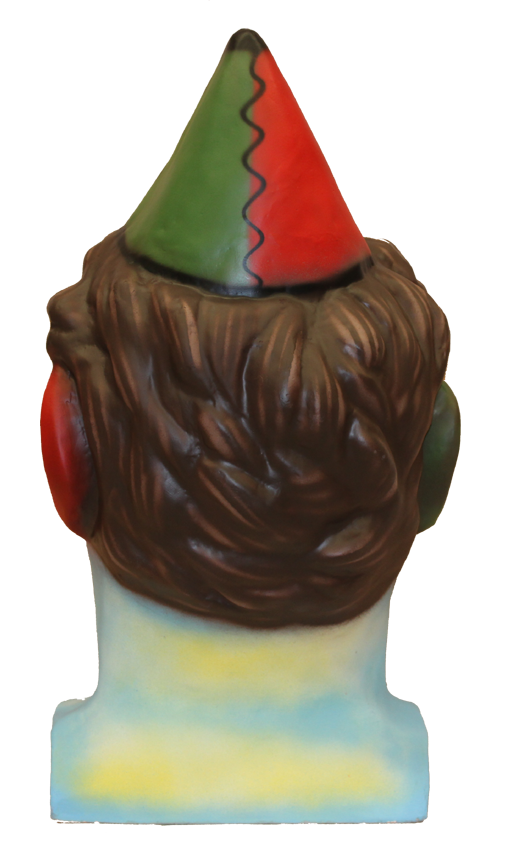 Cabezudo mediano modelo Payaso con base incluida de hombros, principio de pecho y de espalda da una mejor fijación de la Figura sobre el cuerpo del persona que lo lleve, que deberá sujetarlo cuando realice movimientos de baile, carreras o desfiles para mantener un adecuado campo de visión.