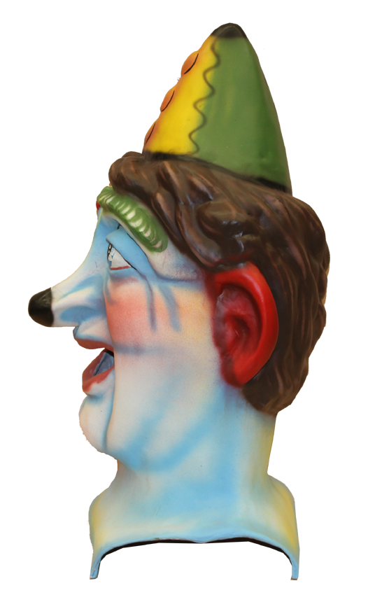 Cabezudo mediano modelo Payaso con base incluida de hombros, principio de pecho y de espalda da una mejor fijación de la Figura sobre el cuerpo del persona que lo lleve, que deberá sujetarlo cuando realice movimientos de baile, carreras o desfiles para mantener un adecuado campo de visión.